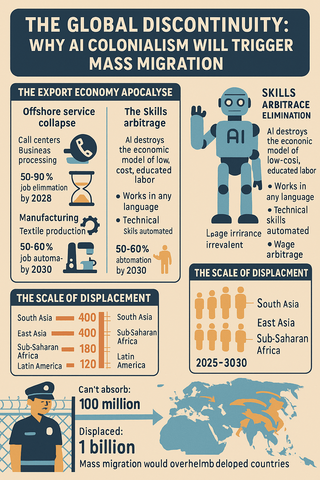 This is the Discontinuity Thesis in action: not gradual change within existing systems, but the wholesale replacement of human cognitive labour with machine intelligence.