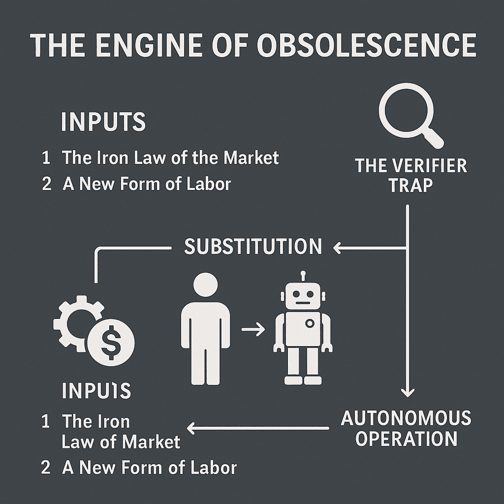 - The “Verifier” Trap: The role of a human verifier paired with AI is transitional. The verifier’s job is to check AI output, effectively training the AI until the verifier is no longer needed. They are engineering their own obsolescence.