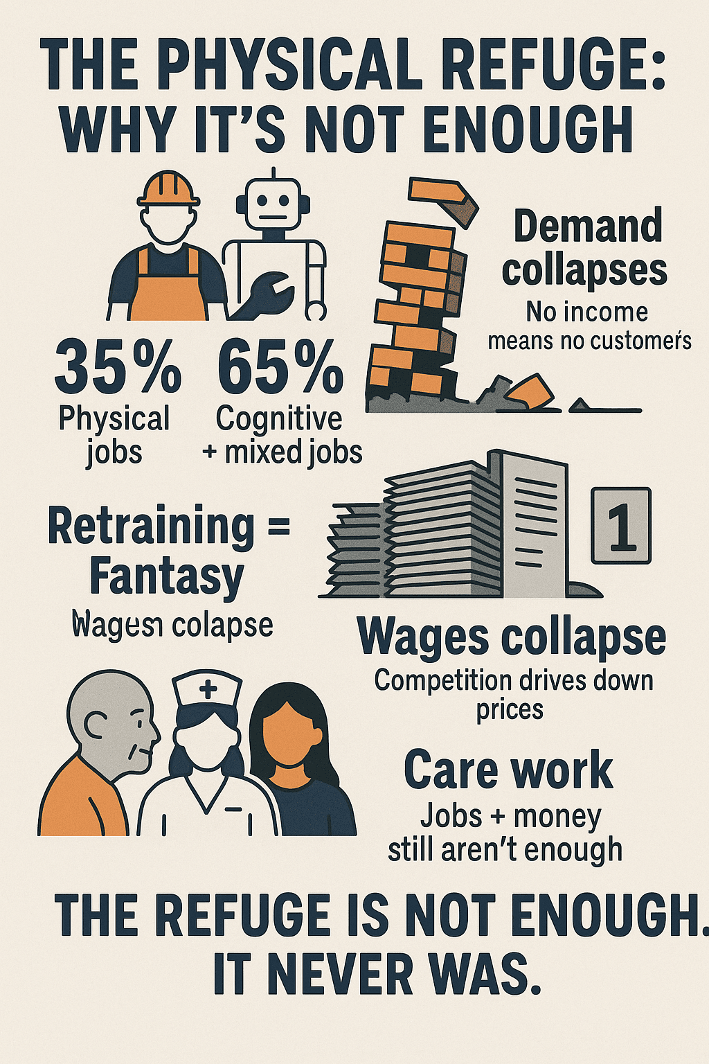 “Humans will focus on emotional work” – This is the “artisanal economy” fantasy. Some premium markets will exist, but not enough to employ hundreds of millions of displaced knowledge workers.