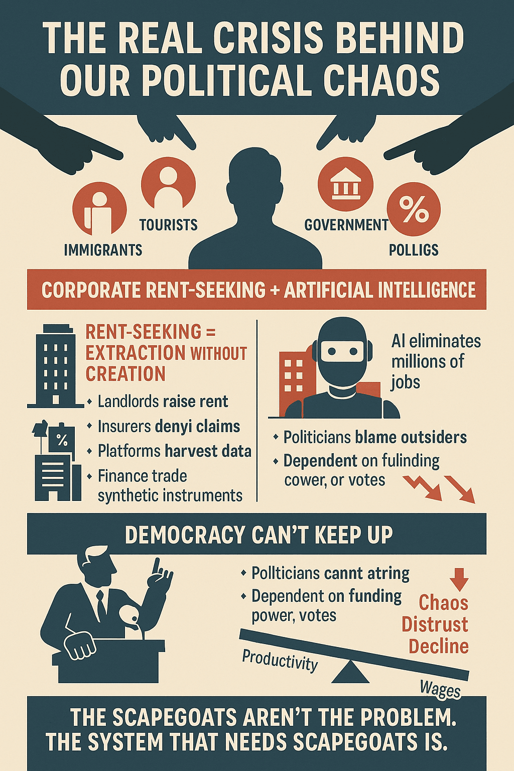 AI severs this circuit. You can have production without mass employment, but then who buys the products? The consumption base collapses. Democratic stability, which depends on a large comfortable middle class, becomes impossible when that middle class no longer has economic function.